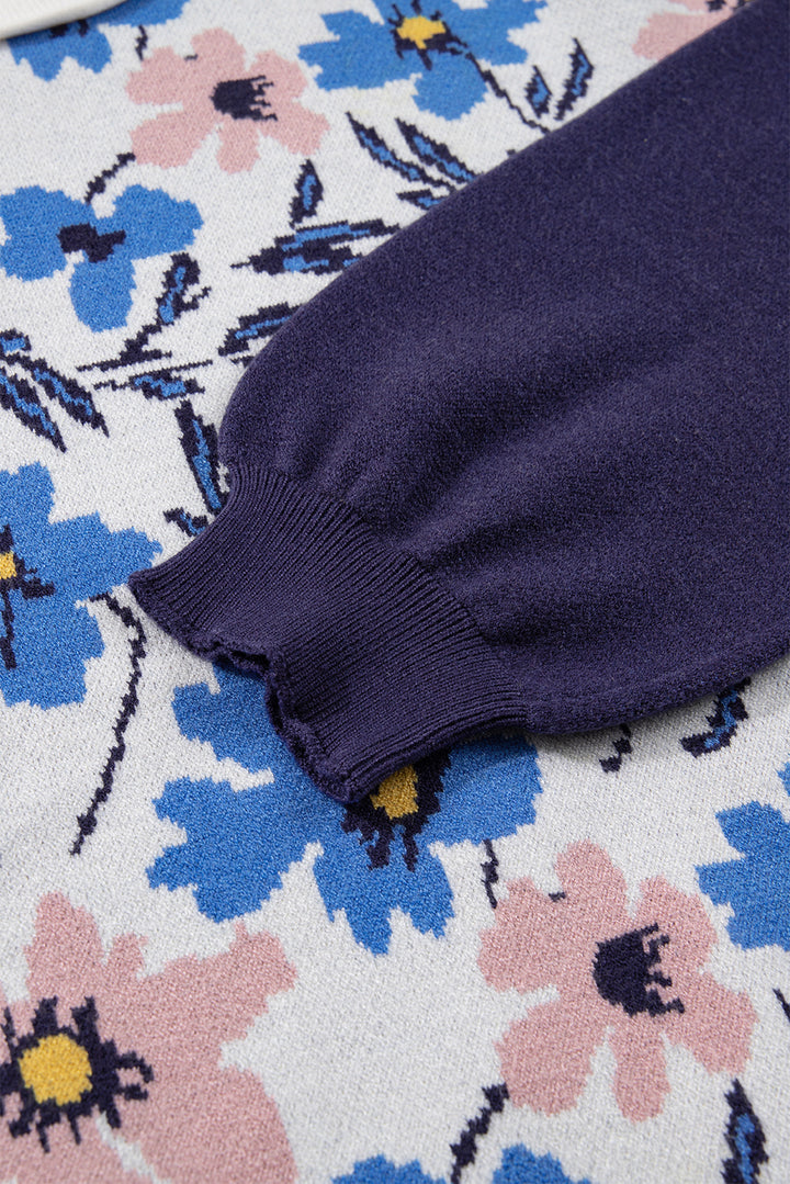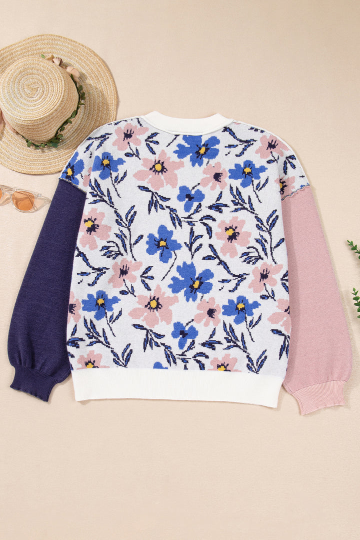 Khaki Vibrant Floral Contrast Colorblock Sleeve Pullover Sweater