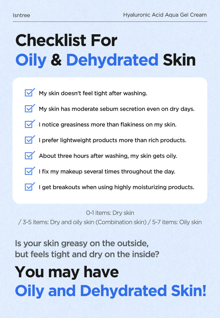 Isntree Hyaluronic Acid Aqua Gel Cream is a daily moisture gel cream with fresh finish that provides moisture to dehydrated skin with natural moisturizing factors and 5 types of hyaluronic acid. It keeps your skin hydrated under the hot sunlight from the inside without feeling sticky.