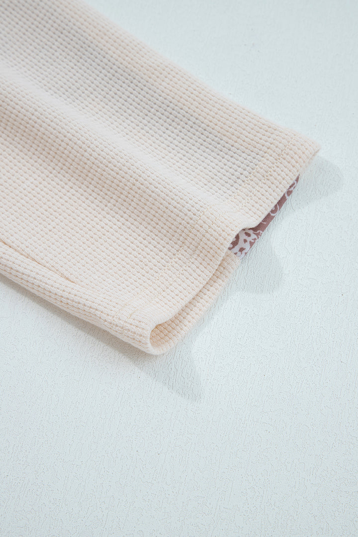 Beige Paisley Ethnic Print Waffle Patchwork Long Sleeve Loose Top