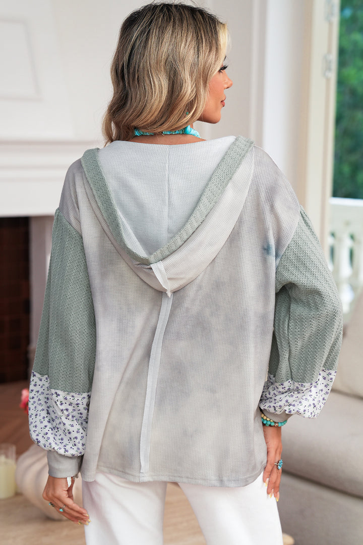 Green Tie-dye Floral Textured Colorblock Patchwork Lantern Sleeve Hooded Top