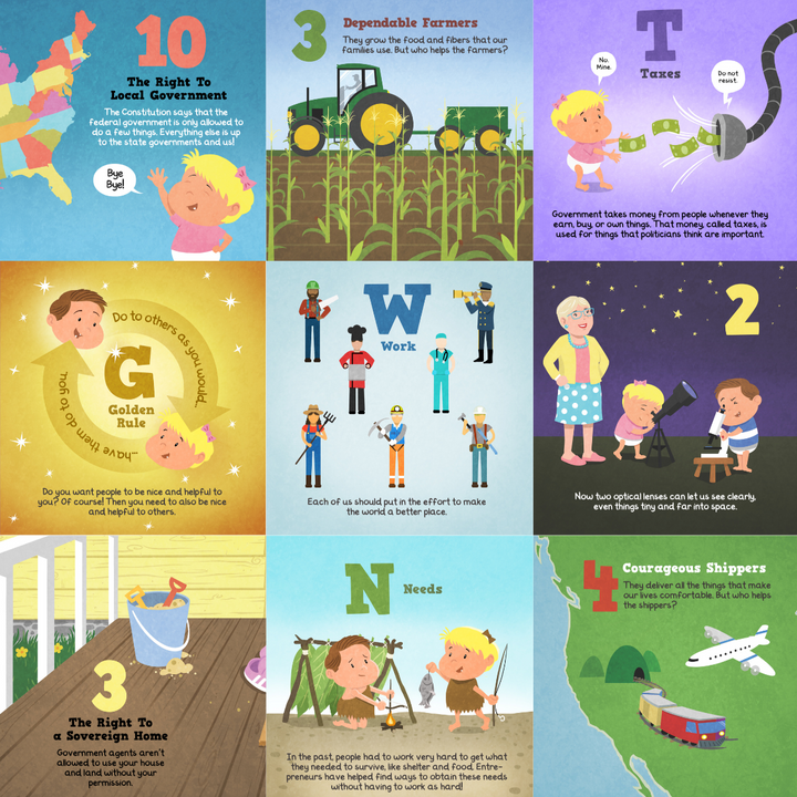 Our goal is to help parents be confident in their knowledge of these principles so they are ready to teach their children. So flip through these books teaching your children their ABCs and 123s while you learn about innovation, economics, the Bill of Rights, and more.