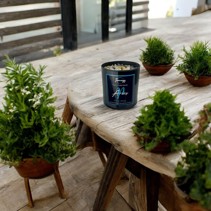 Embrace the dynamic energy of Aries with our Zodiac Crystal Candle, specially crafted to resonate with the bold and adventurous spirit of this fire sign. The Aries Zodiac Crystal Candle is infused with the invigorating Arctic Winds scent, a robust and energizing blend that combines the crispness of eucalyptus, the herbal clarity of rosemary, the grounding essence of cedar, and the calming hint of lavender. This fragrance is a homage to the courageous, enthusiastic, and determined nature of Aries.