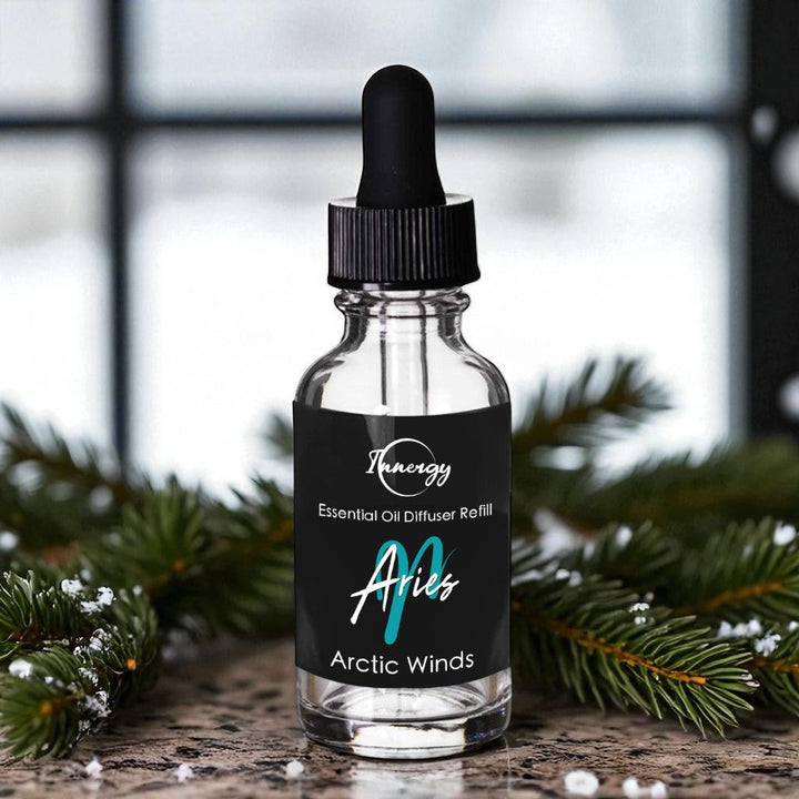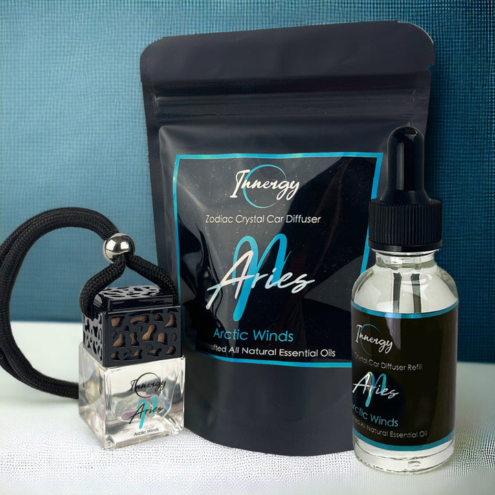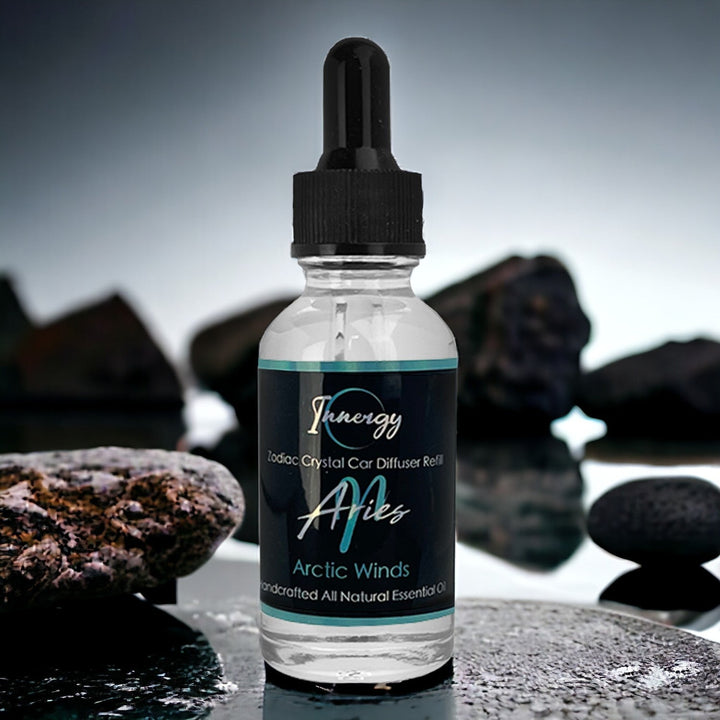 Ignite the fire within with our Aries Zodiac Crystal-Enhanced Car Diffuser. Immerse yourself in the invigorating scent of Arctic Winds, a fragrance with notes of eucalyptus, rosemary, cedar, and lavender, crafted to complement the bold spirit of Aries.