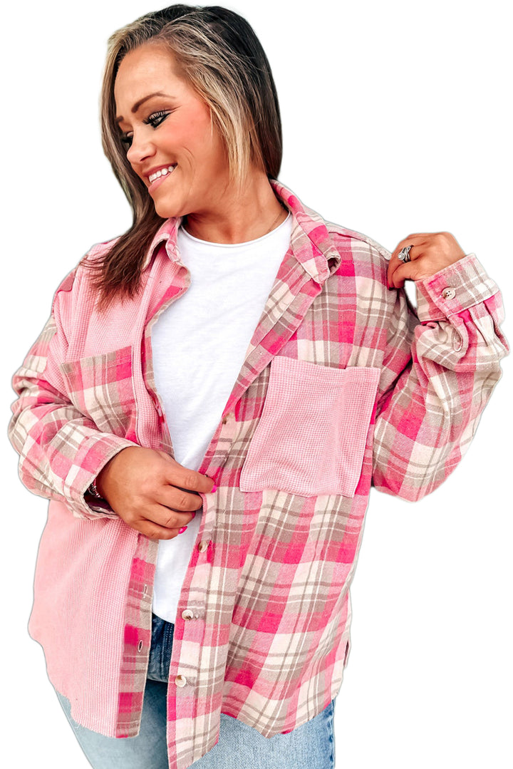 Pink Waffle Pocket Plaid Patchwork Plus Size Shirt