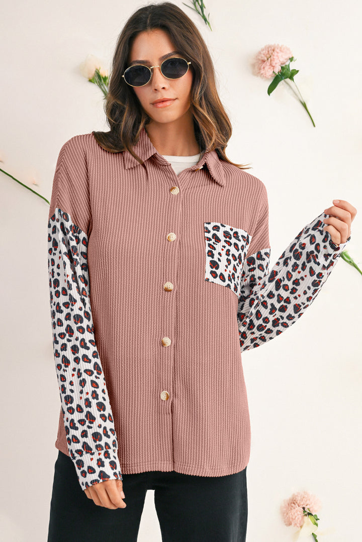 • Stand out in style with the leopard patchwork shacket, featuring a unique twist of ribbed design for added texture and flair.
