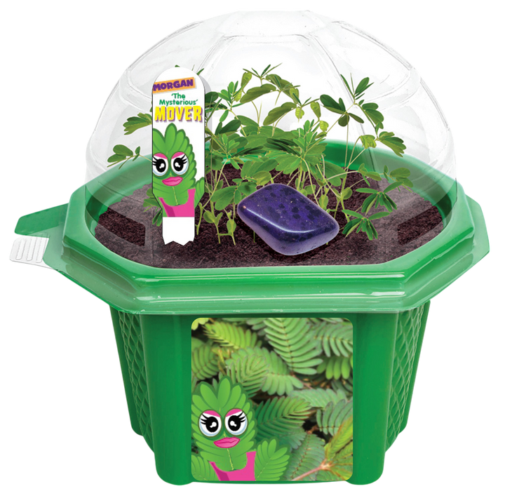 Morgan the Mover likes to grow on land and has cousins that like to grow in water. But what is fascinating about these plants is that they are able to move their leaves and branches when you touch them! They also move them when exposed to cold, loud noise, or darkness. The leaves will reopen within an hour and a half after closing. They also close up every night and open up every morning. This fun and entertaining kit comes with everything you need, even a collectible plant stake and genuine purple jasper stone- just add water! The purple Jasper represents the mysterious nature of this amazing plant.