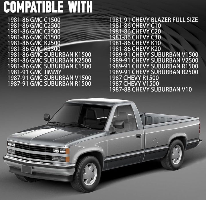 Fits For: 1981-1986 GMC C1500 C2500 C3500 K1500 K2500 K3500 Suburban K1500 K2500 C1500 | 1981-1991 Jimmy | 1987-91 Suburban V1500 R1500 | | 1981-1991 Chevy Blazer Full Size | 1981-86 Chevy C10 C20 C30 K10 K20 | 1989-1991 Chevy Suburban V1500 V2500 R1500 R2500 | 1987 Chevy R1500 V1500 | 1987-1988 Chevt Suburban V10 | Note:Please check the corresponding year of the model carefully before purchasing, most are only for 1981-1986 or 1987-1991, to ensure that it is suitable for your car