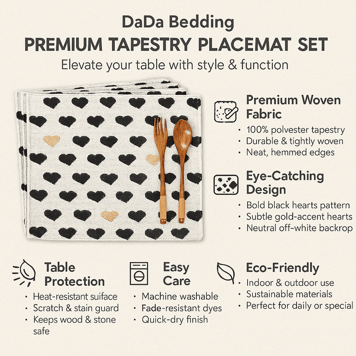 Decorate your dining table with our beautiful and colorful black and yellow heart shaped one of a kind DaDa Bedding tapestry placemats.