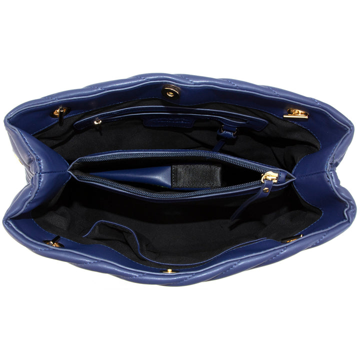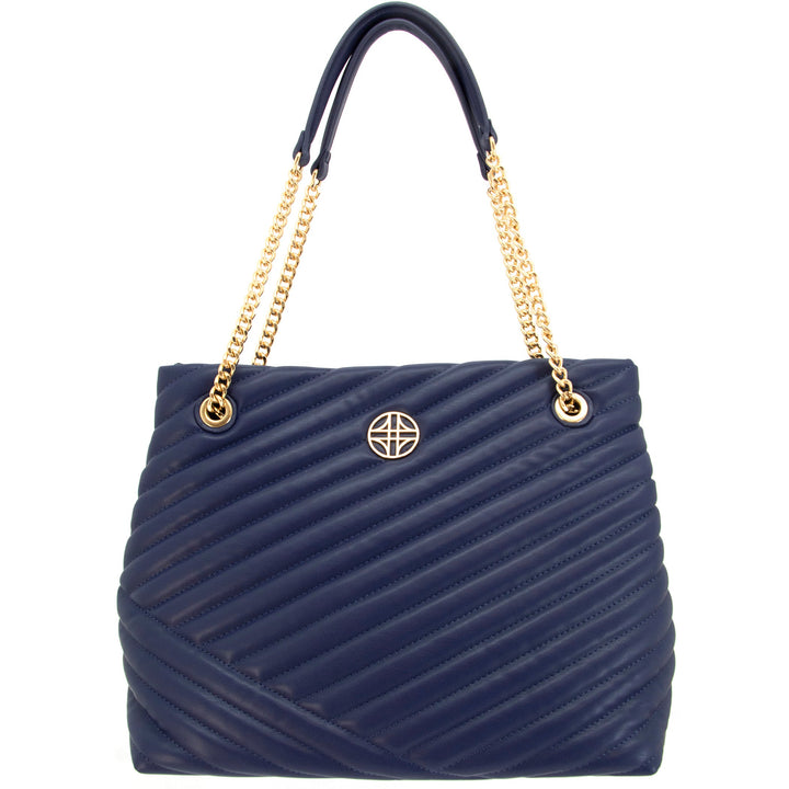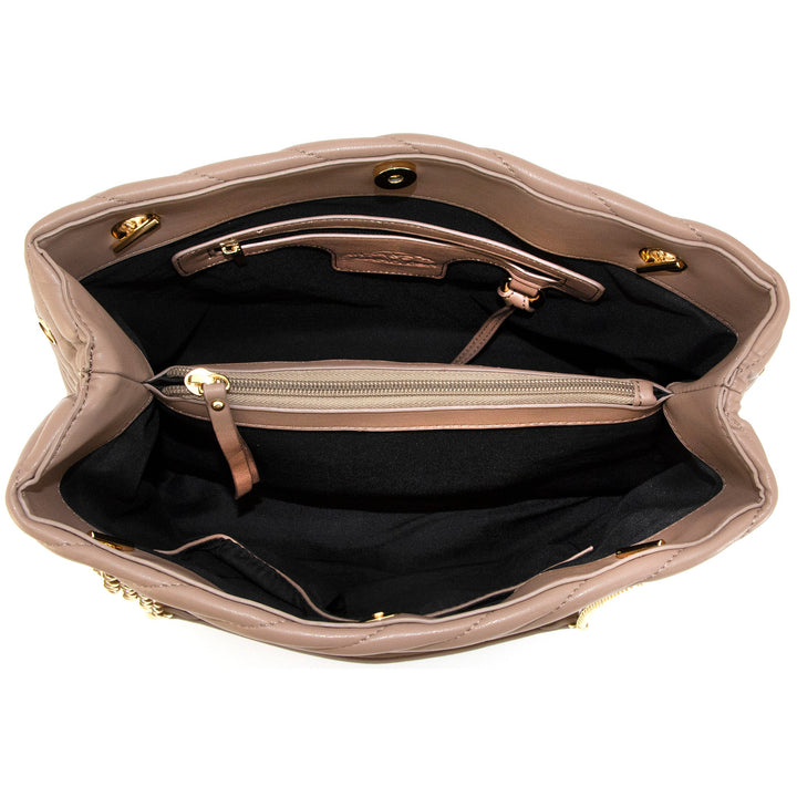 Flora is vegan leather, quilted tote featuring an open-top with snap tab closure and gold medallion detail. It has parallel, vegan leather handled, curb chain straps, and expanding side panels with snaps.