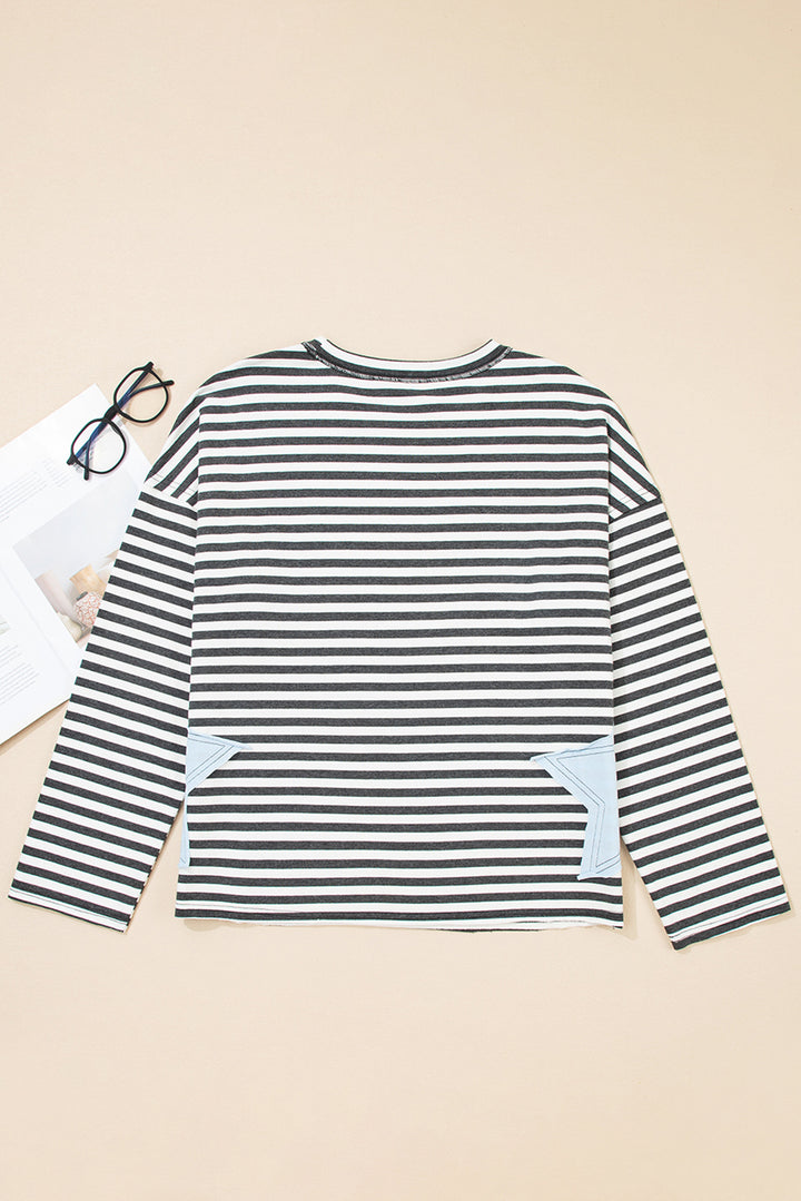 Gray Stripe Contrast Star Stitched Plus Size Long Sleeve Top
