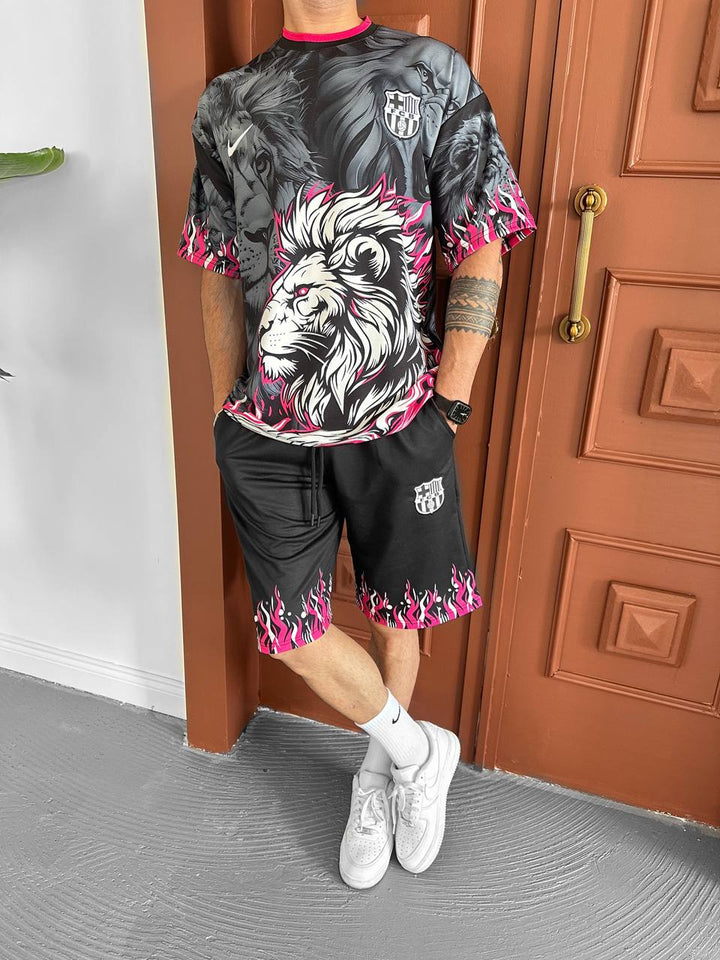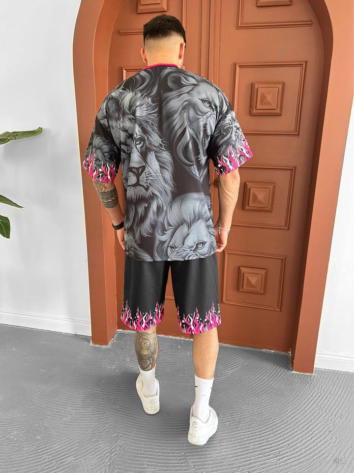 Lion Blaze Men's Graphic Tee & Flame Shorts Set – Fiery Streetwear with Bold Lion Print