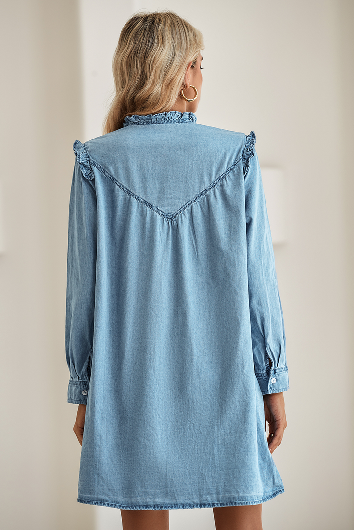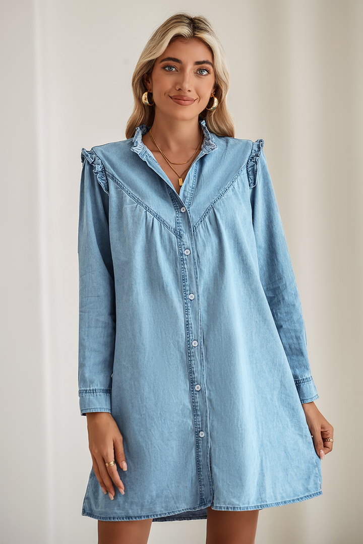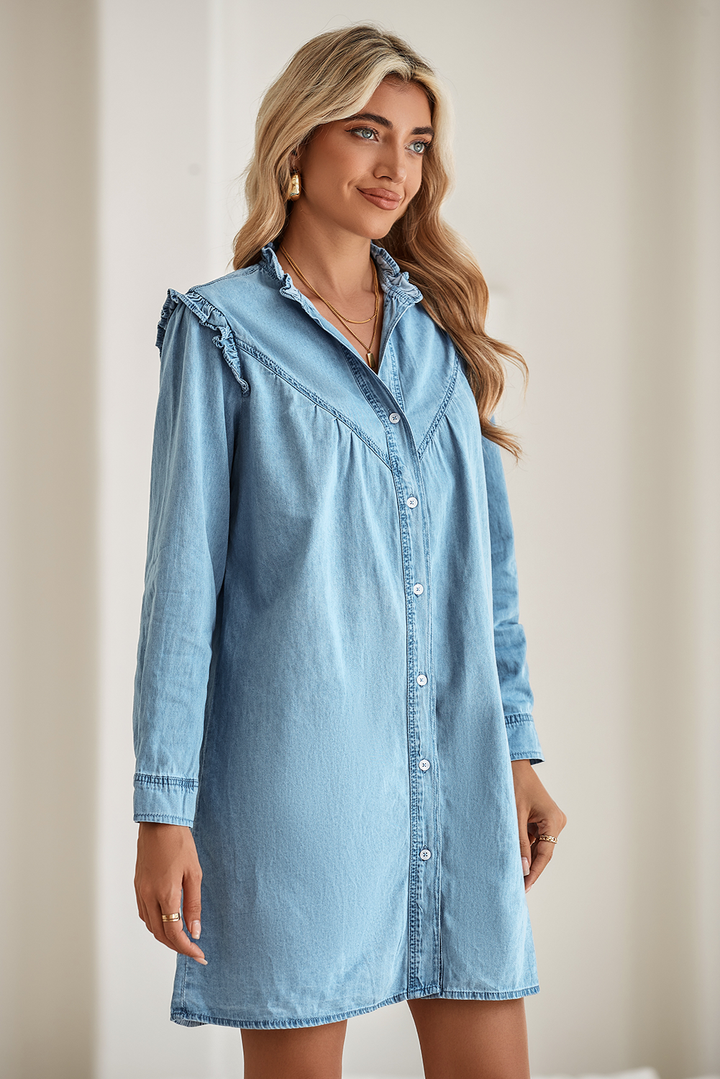 - Elevate your casual wardrobe with the mini dress, featuring a charming frill detail and stylish button accents.