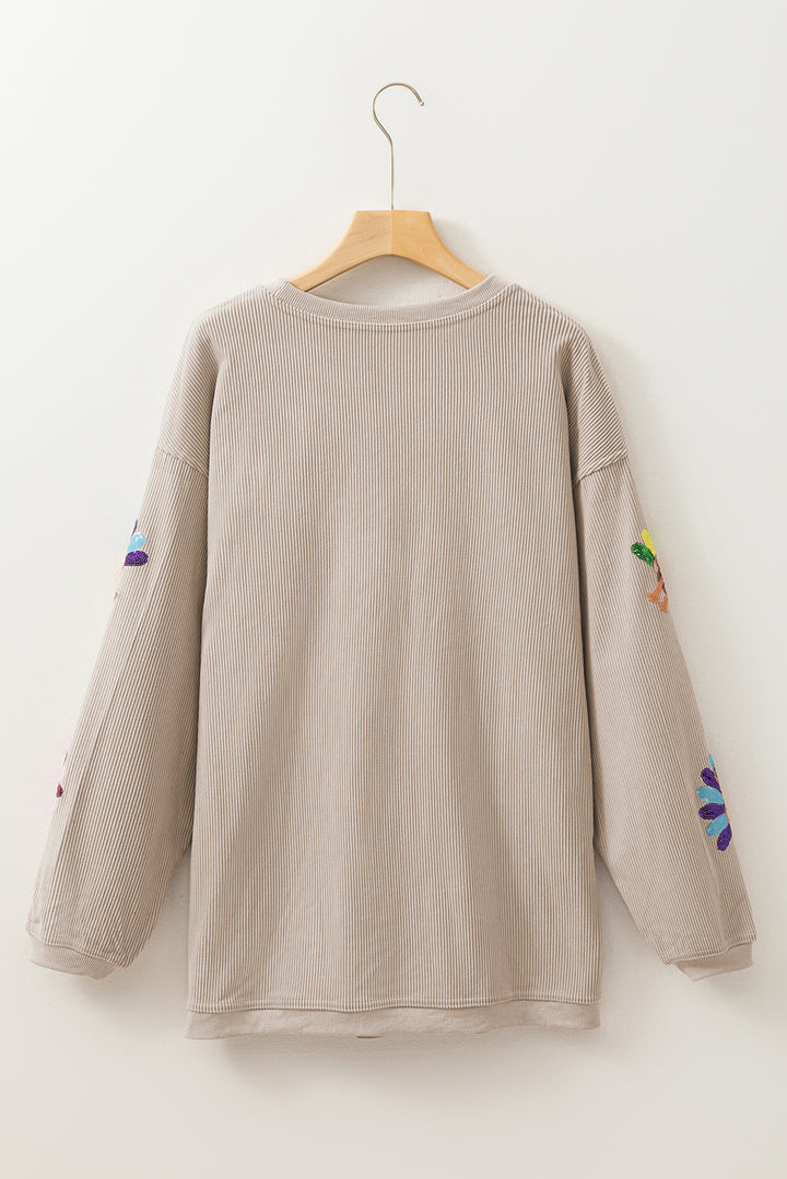 - The colorful glitter turkey graphic makes this sweatshirt eye-catching.