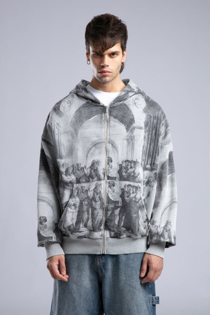 The Oversized Art Print Zip-Up Hoodie blends timeless art with bold streetwear energy. Featuring an all-over vintage wash and Renaissance-style print, this full-zip hoodie brings gallery-level aesthetics into your daily look.