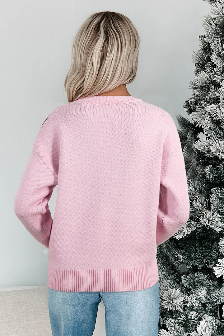 Pink Christmas Ginger Bread Man Print Round Neck Casual Sweater