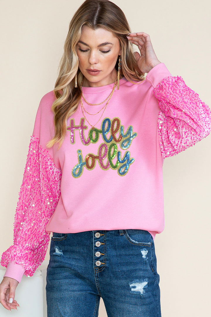 Pink Holly Jolly Letter Sequins Patch Drop Shoulder Patchwork Long Sleeve Top