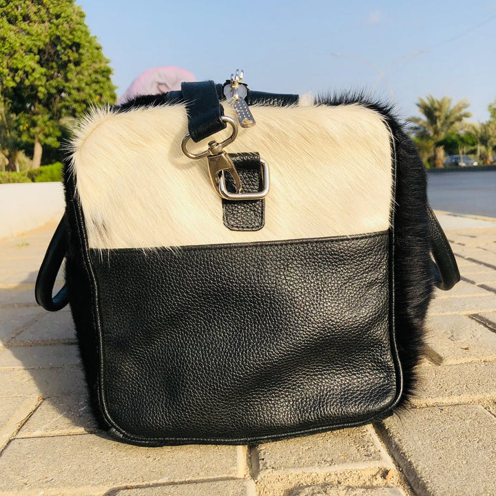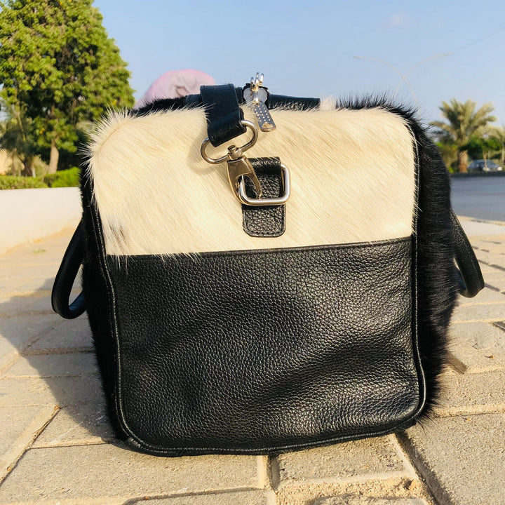 Introducing our stunning Medium Cowhide Duffel Bag - the perfect blend of luxurious genuine leather and unique animal print design that will make heads turn. Handcrafted with painstaking attention to detail, this exquisite cowhide duffel bag hair on bag animal print bag size 20x12x11 is not only a statement piece but also the ideal companion for weekend getaways, business trips, or a stylish gift for that special someone. Its versatile and eye-catching design makes it an exceptional gift for both him and her.
