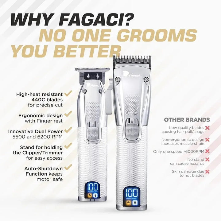 • 🔋BATTERY 5H CLIPPER & 3H TRIMMER - Fagaci hair clipper and trimmer makes your life easier. With 5 hours of battery life for clippers, you will never run out of battery during a haircut like with other clippers on the market. The hair trimmer has a powerful battery that lasts 3 hours. The all-day battery life in just 3 hours of charging for both. Plus they have a charging stand for easier charging and a corded/cordless function.