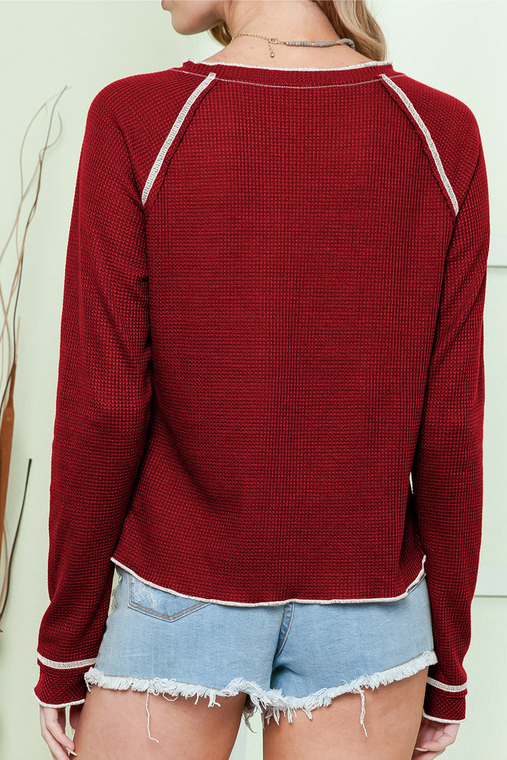 Red Exposed Seam Textured Pullover Long Sleeve Top