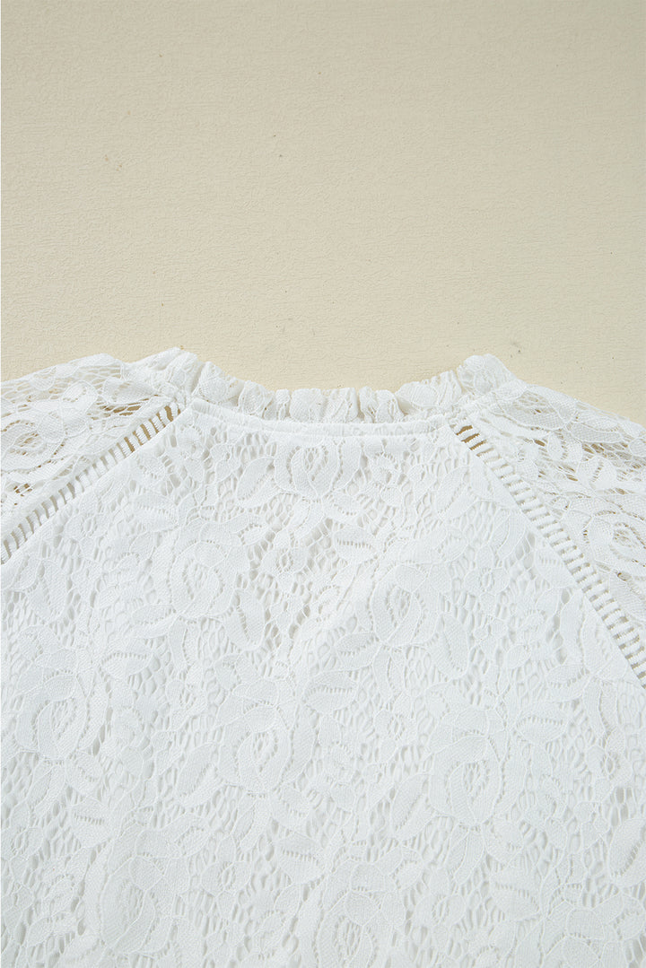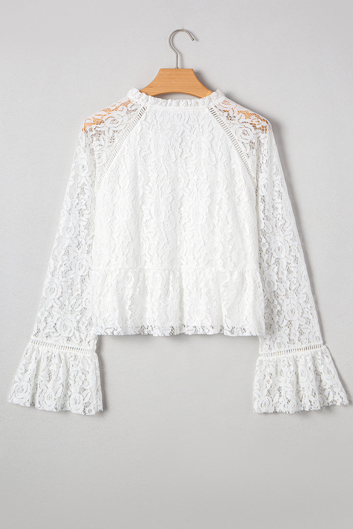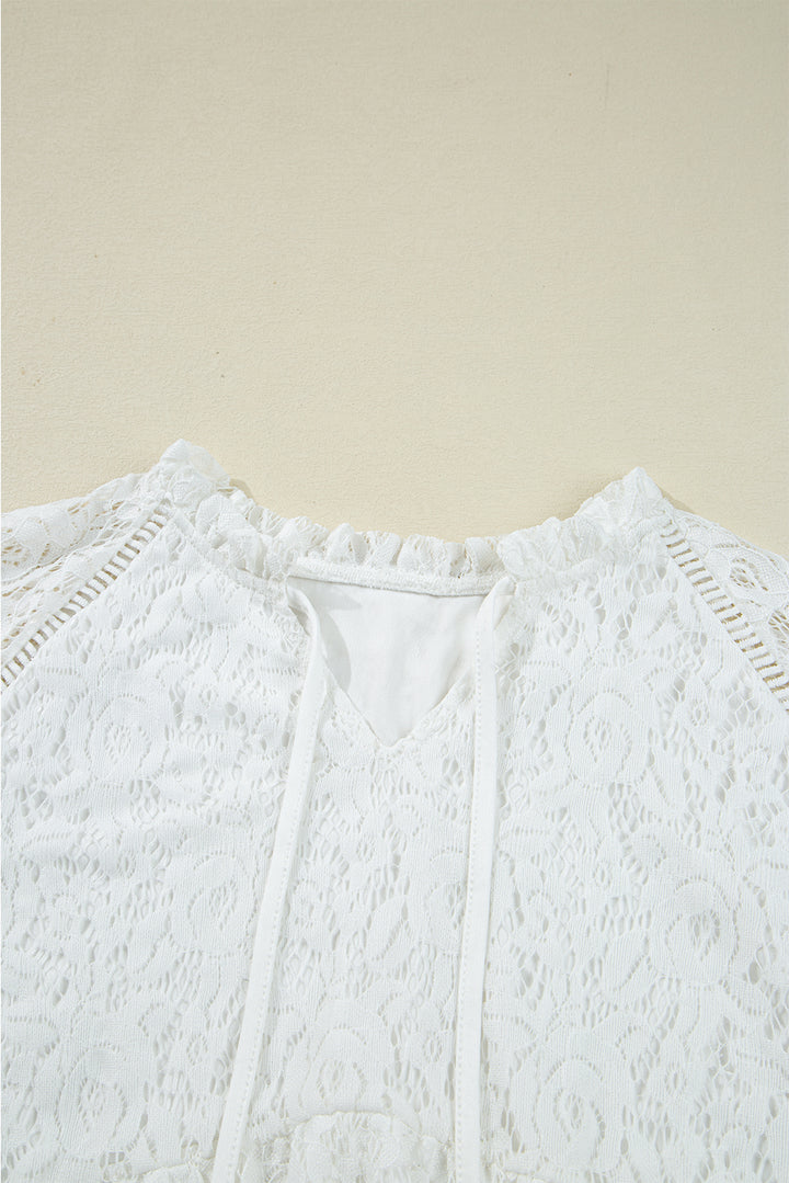 White Tie V Neck Lace Ruffle Detail Long Sleeve Blouse