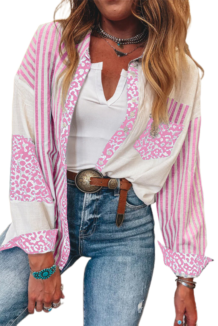 Sky Blue Leopard Striped Patchwork Button-up Shirt Shacket