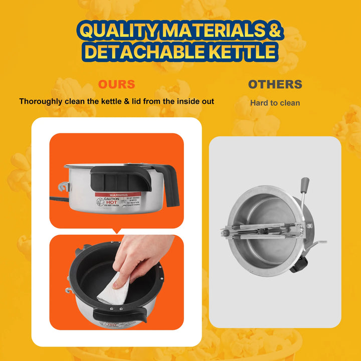 Durable and Easy to Clean: Built with a sturdy cold-rolled steel frame and tempered glass, this popcorn maker can handle frequent use. The easy-to-remove kettle lid and magnetic latch door ensure simple access for cleaning, extending the machine’s lifespan.