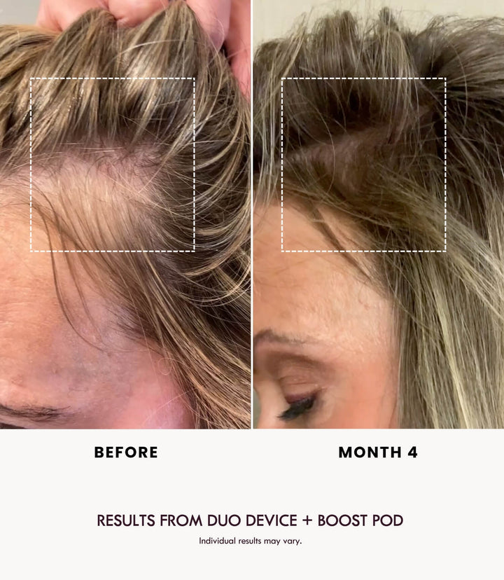The BOOST DUO POD is a breakthrough in hair thinning. Designed for men and women alike experiencing the signs of hair thinning or fallout, our ultra-lightweight, water-based formula is packed with a proprietary complex of vitamin B3, caffeine, peptides, blue tansy, and green tea leaf extract to boost cell renewal for thicker-looking, stronger-feeling hair.