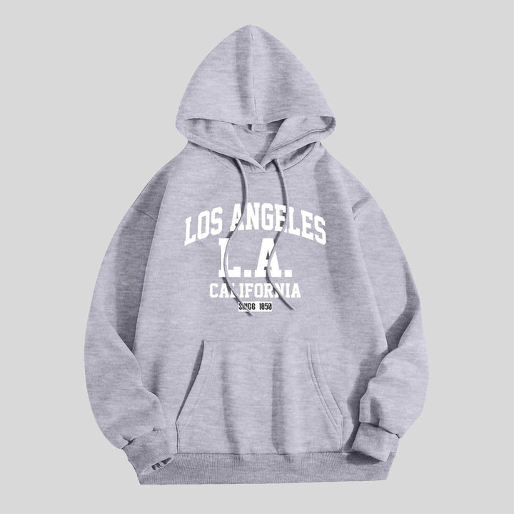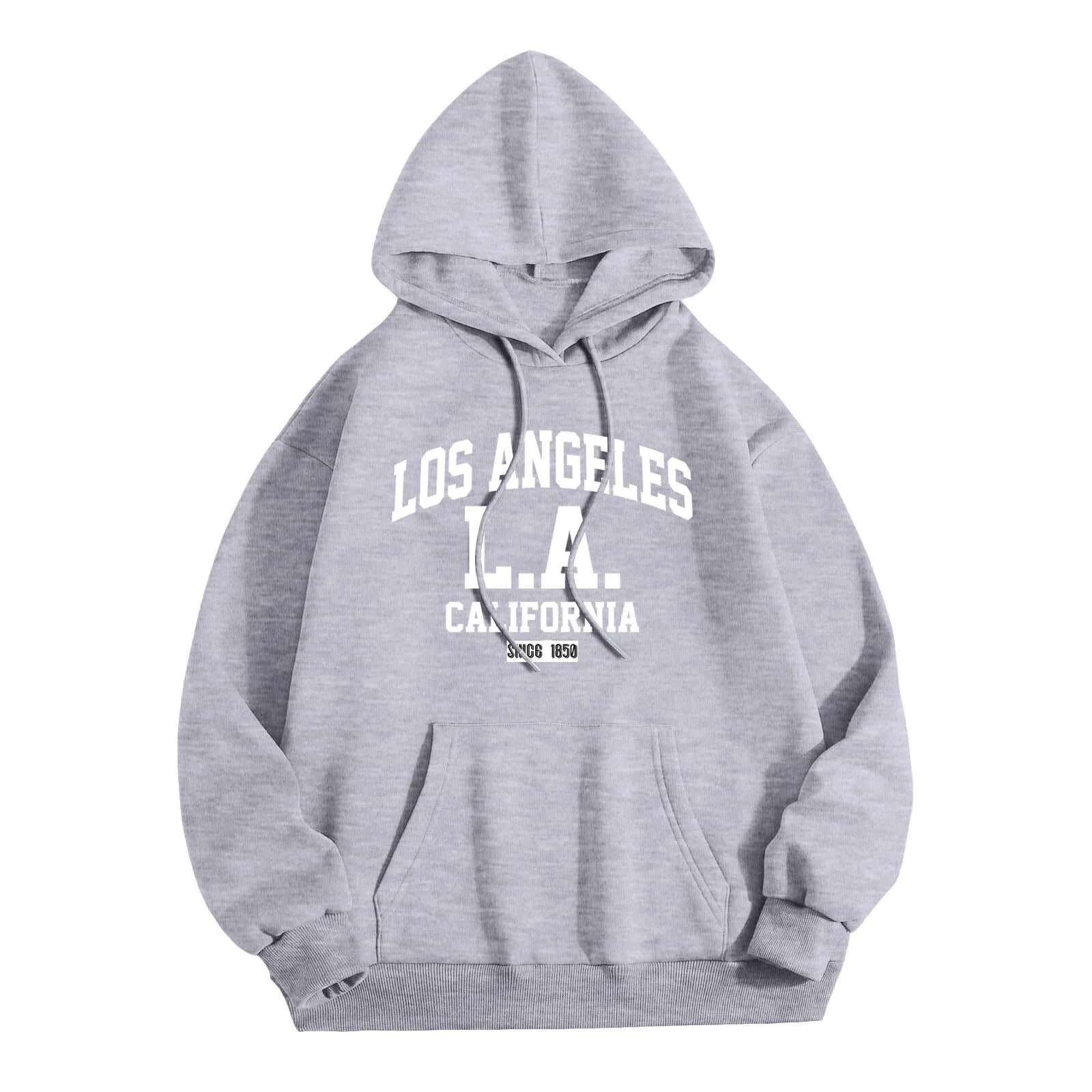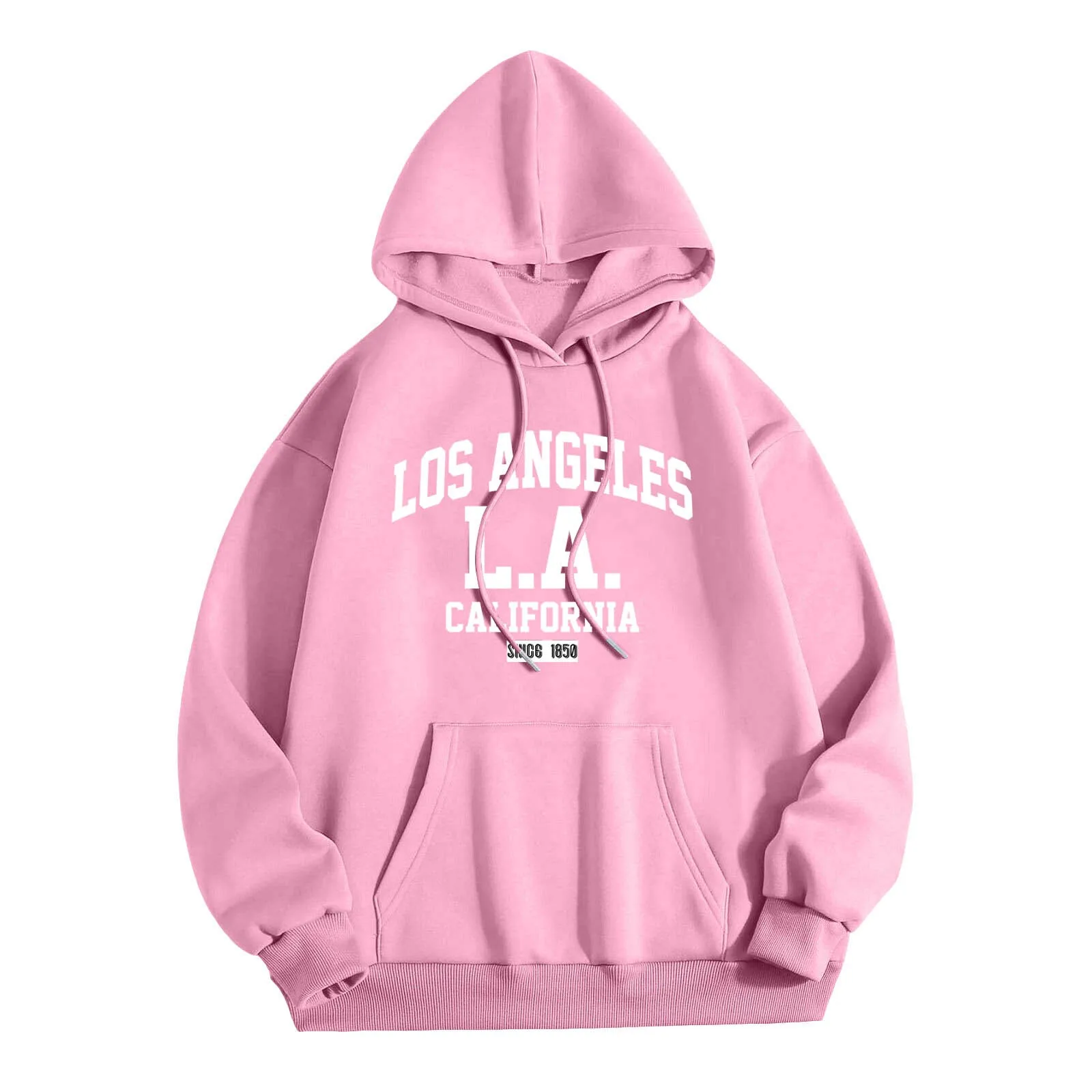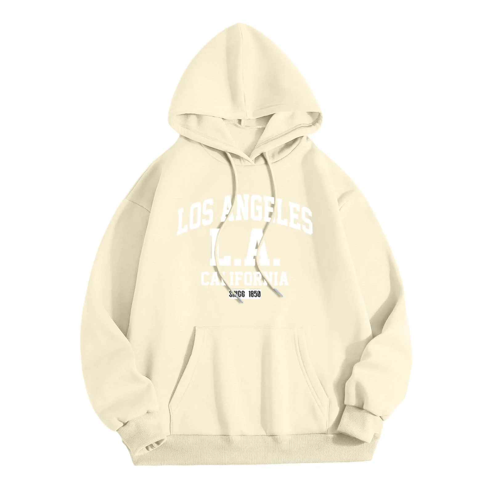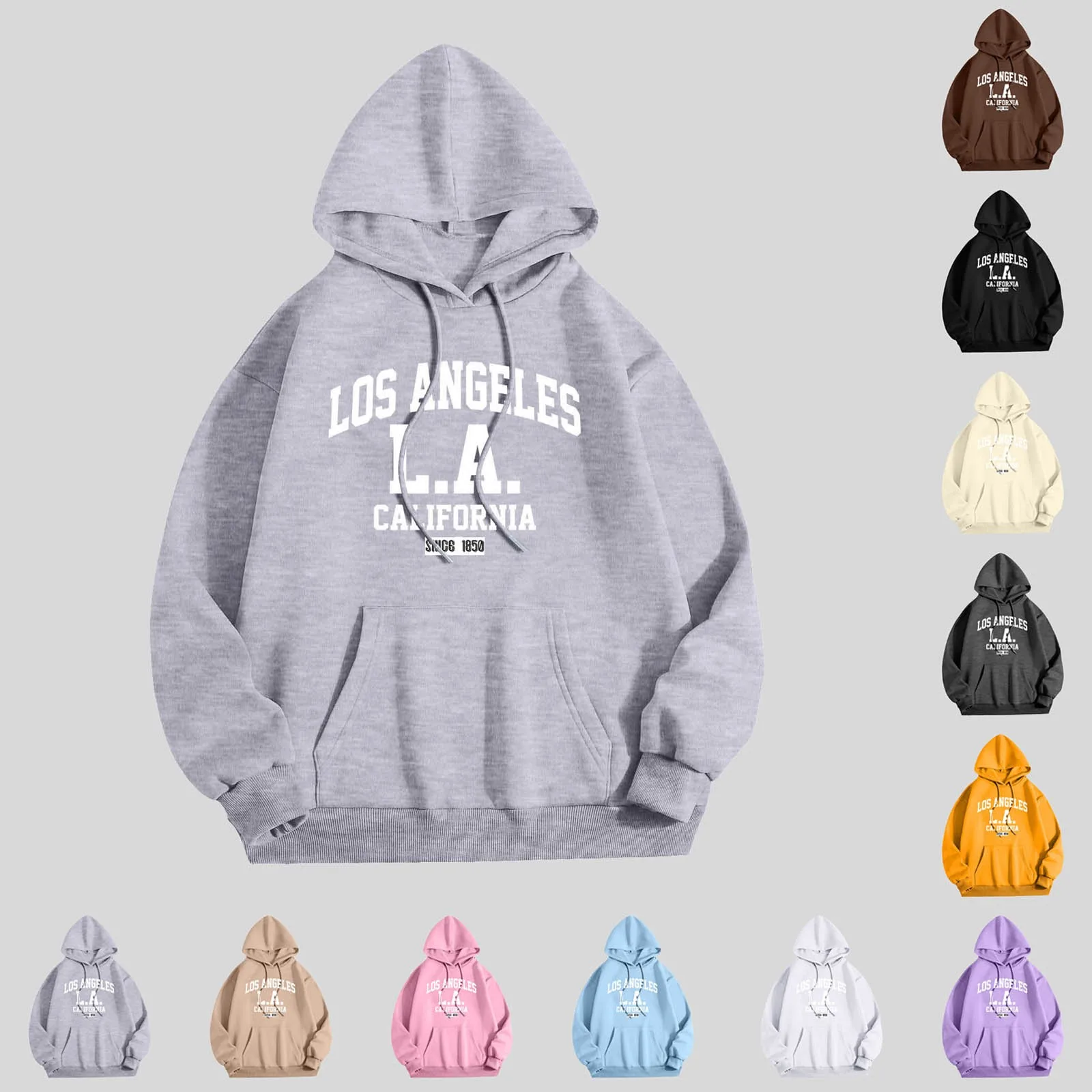 Women's Plain Basics Brushed Letters Loose Fit Hooded Sweatshirts Long Sleeves Pockets Shoulders Pullovers