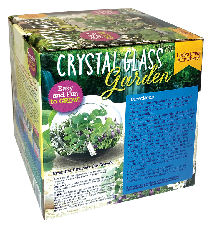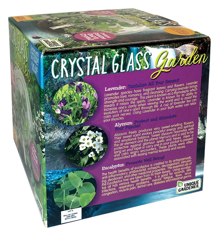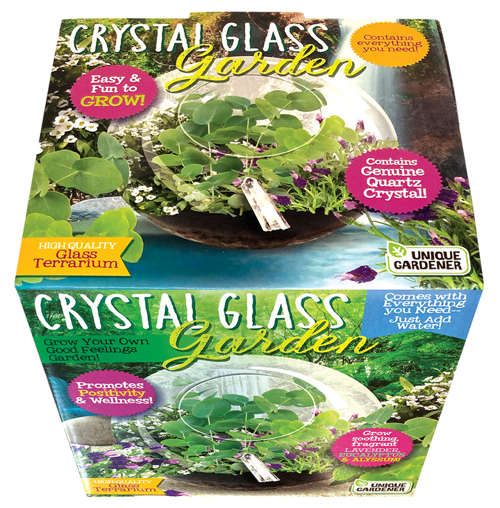 Eucalyptus, Lavender, and Sweet Alyssum will sprout and flourish in the included high-quality 8” Glass Terrarium. Everything you need is included, the seeds, quartz crystal, and growing medium- just add water! Our seeds are guaranteed to sprout and germinate for even the most novice of gardeners, and plant lovers and enthusiasts alike! Grow your own powerful Crystal Glass Garden now!
