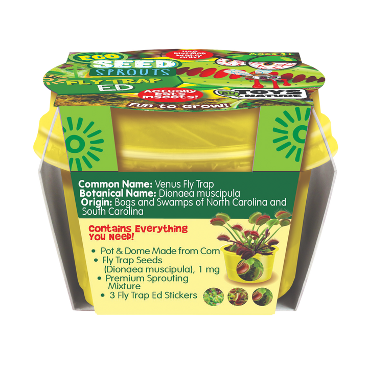 Nurture nature, one sprout at a time! Eco Seed Sprouts bring the fun into growing by allowing us to explore the magic of nature right at home, turning every sprout into an exciting discovery! Grow a fascinating Flytrap friend with Fly Trap Ed. Flytraps are carnivorous plants that naturally capture and digest small insects. Flytraps can live up to 30 years! Includes 3 stickers to decorate your reusable, high quality planter. The terrarium has a fitted lid that snaps closed to prevent unwanted spills. Instructions included. Multipack of 5. Guaranteed to Grow! Must use distilled water – avoid tap water.