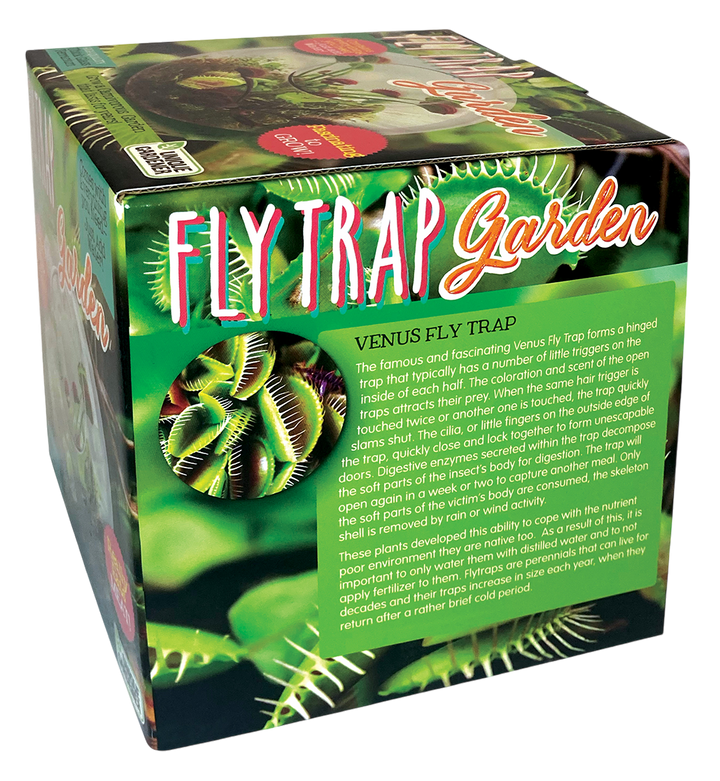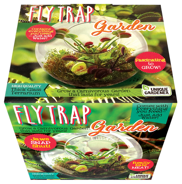 Grow meat-eating fly traps in our high-quality, custom-crafted glass terrarium. This limited and exclusive collection of flytraps are really carnivorous! Although they take some time to sprout, they are fascinating to grow. The Fly Traps kit comes complete with everything you need to get going- just add water! You can only use distilled water as the plants cannot tolerate the minerals and salts in tap or spring water. Start your fearsome plant collection today!