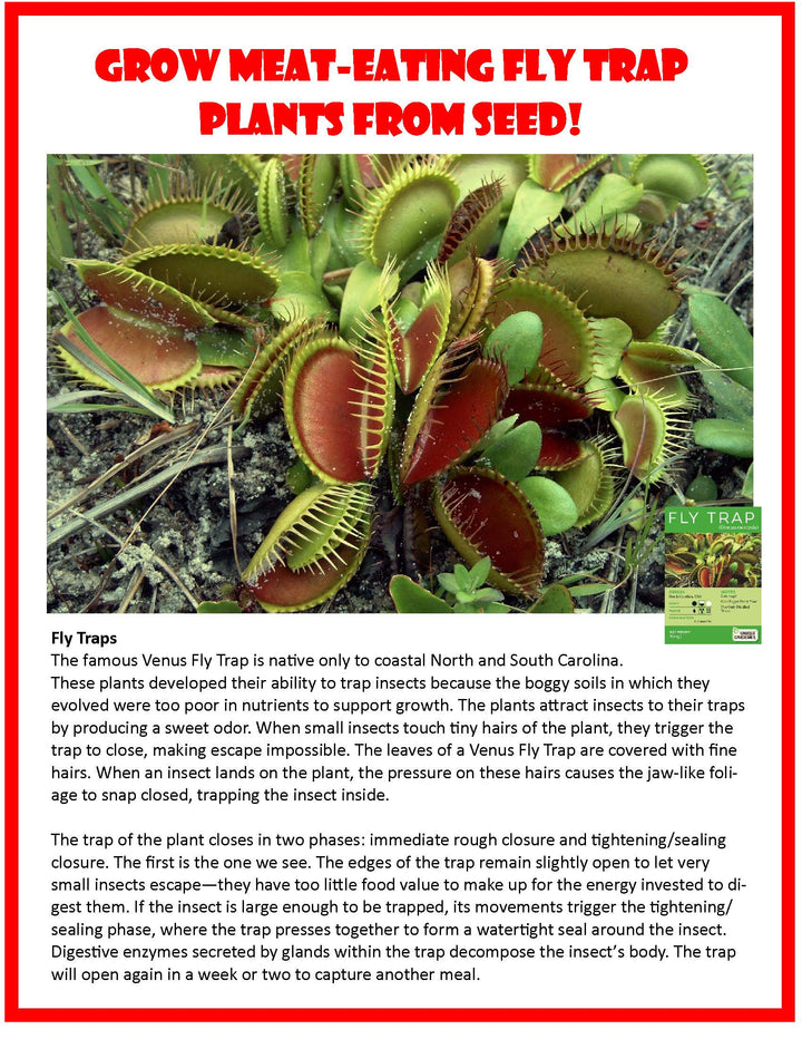 These plants developed this ability to cope with the nutrient poor environment they are native too. As a result of this, it is important to only water them with distilled water and to not apply fertilizer to them. Flytraps are perennials that can live for decades and their traps increase in size each year, when they return after a rather brief cold period.