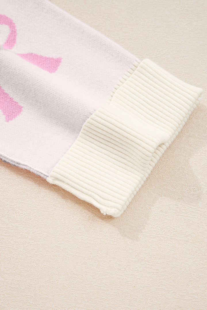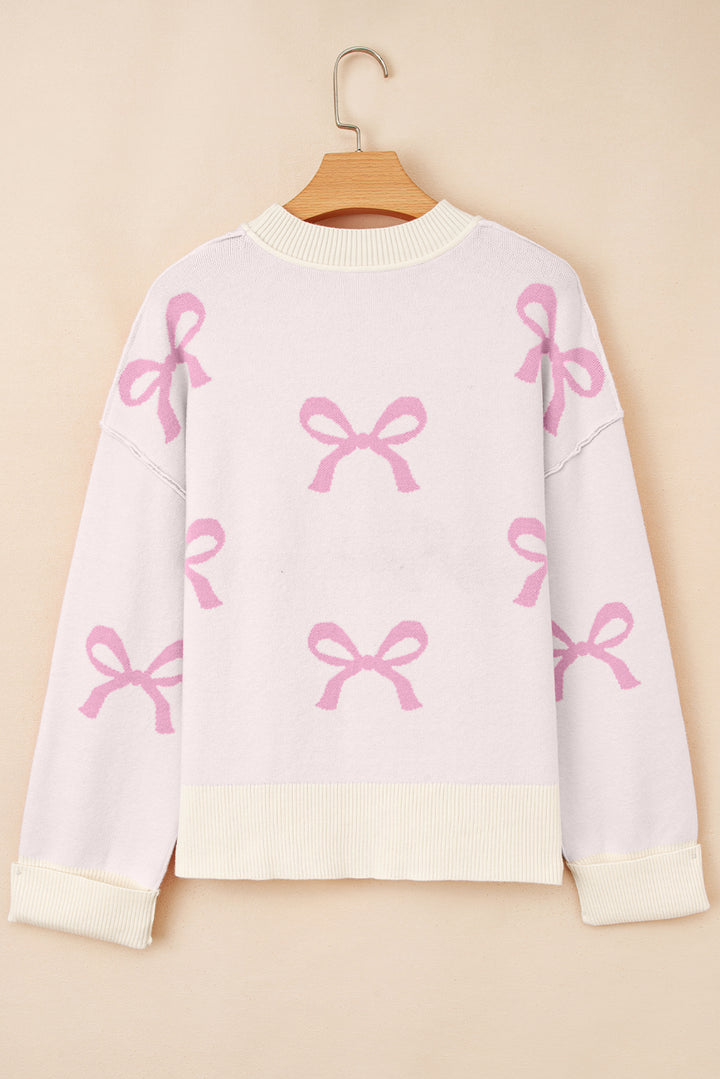 Pink Bow Print Exposed Seam Drop Sleeve Sweater