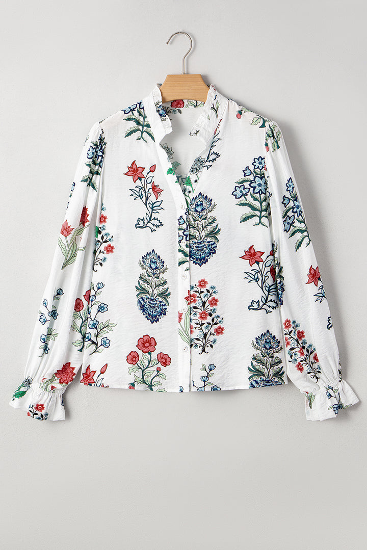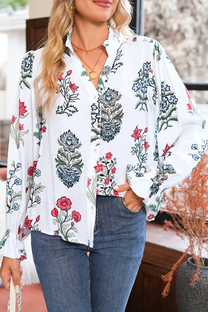 White Floral Print V Neck Loose Drop Sleeve Shirt